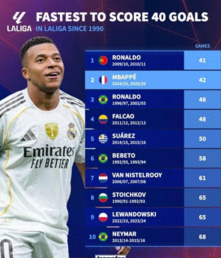 西甲40球神速榜:C罗41场居首姆巴佩42场紧随其后